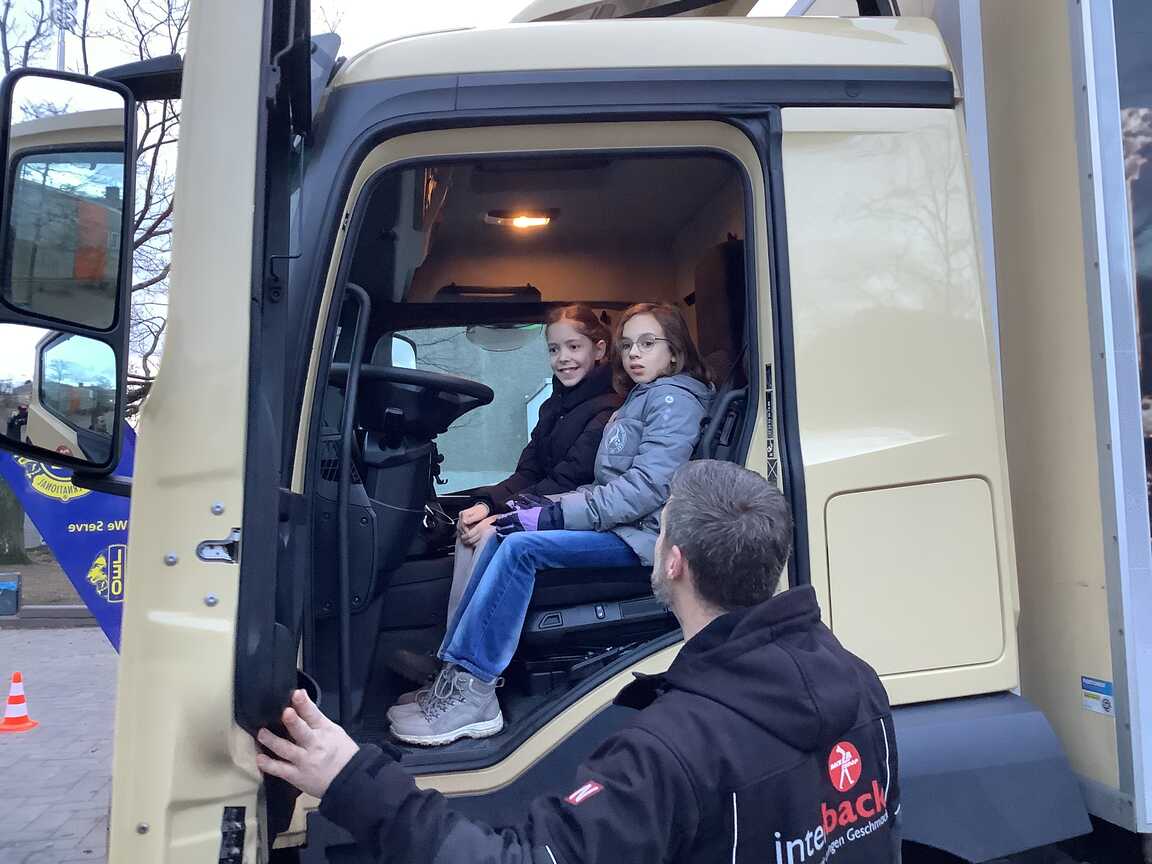 Am Freitag, den 16.1.2026 erlebten die 4. KlässlerInnen eine besondere Aktion zum Thema Verkehrssicherheit, die in Kooperation des Straßenverkehrsamtes Mettmann, der Polizei, der Firma Interback und dem Lions-Club organisiert wurde. Die Schülerinnen und Schüler lernten aus verschiedenen Perspektiven den Toten Winkel eines LKW kennen. Beim Blick aus dem Fahrerhaus des LKW stellten sie fest, wie wenig man von dort oben sehen kann. Auch die Seitenspiegel gaben keine vollständige Sicht. So konnte eine ganze Schulklasse ungesehen vom Fahrer neben dem Lastwagen stehen. Das war eine spannende Erfahrung und hat das Bewusstsein geschärft, Respekt vor diesen großen Fahrzeugen zu haben und ausreichend Abstand im Straßenverkehr zu halten. Wir bedanken uns für dieses tolle Erlebnis!