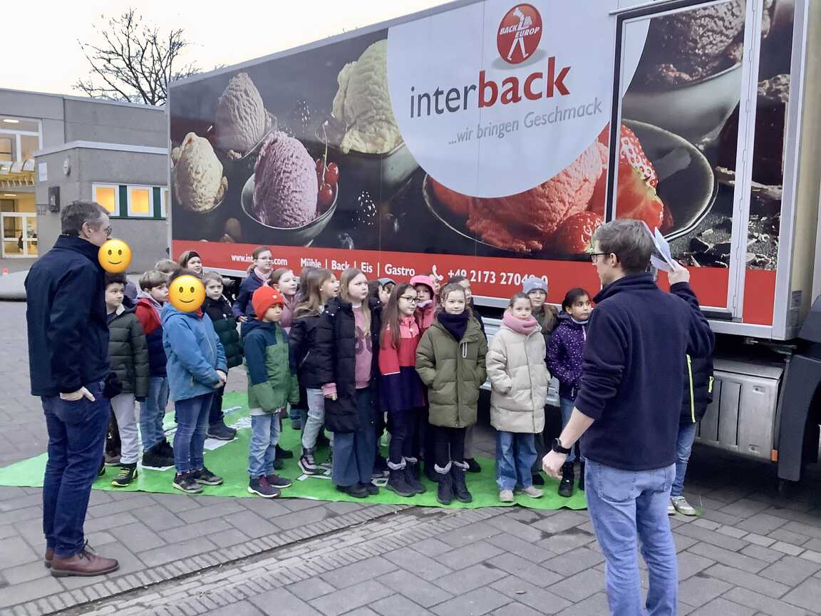 Am Freitag, den 16.1.2026 erlebten die 4. KlässlerInnen eine besondere Aktion zum Thema Verkehrssicherheit, die in Kooperation des Straßenverkehrsamtes Mettmann, der Polizei, der Firma Interback und dem Lions-Club organisiert wurde. Die Schülerinnen und Schüler lernten aus verschiedenen Perspektiven den Toten Winkel eines LKW kennen. Beim Blick aus dem Fahrerhaus des LKW stellten sie fest, wie wenig man von dort oben sehen kann. Auch die Seitenspiegel gaben keine vollständige Sicht. So konnte eine ganze Schulklasse ungesehen vom Fahrer neben dem Lastwagen stehen. Das war eine spannende Erfahrung und hat das Bewusstsein geschärft, Respekt vor diesen großen Fahrzeugen zu haben und ausreichend Abstand im Straßenverkehr zu halten. Wir bedanken uns für dieses tolle Erlebnis!