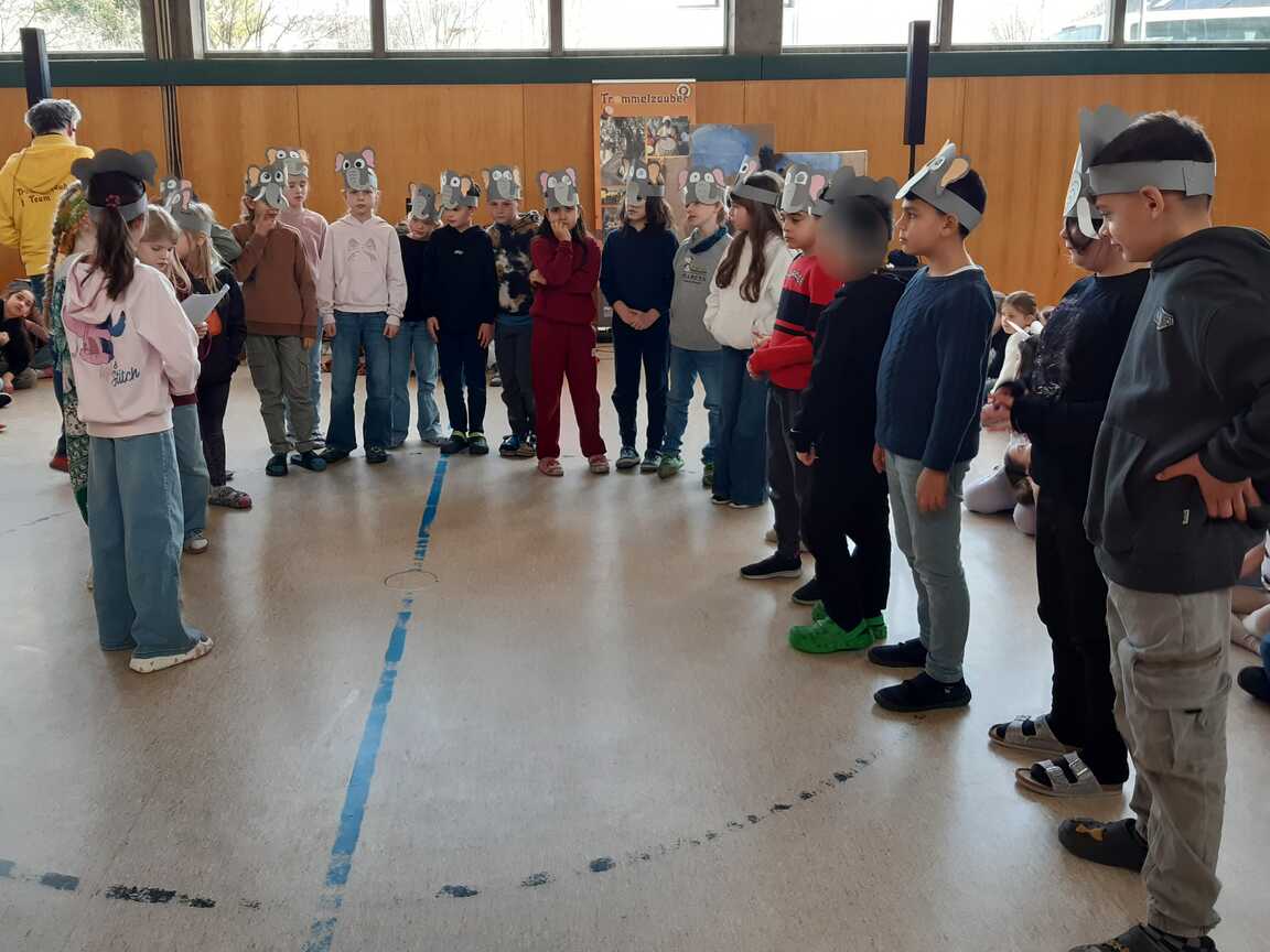 Wir sind jeden Tag 15 Minuten in der Klasse gewesen. Danach ging es zwei Stunden in die Turnhalle. Da trommelten wir alle. Als die erste Stunde vorbei war, sind nur noch die 3. Klässler geblieben. Und als wir gehen konnten, kamen die 4. Klässler. Wir waren Elefanten und haben einen Tanz vorgeführt. Das Stück spielte in Afrika und handelte von einem Fest. Als Erstes wurde geerntet und dann wurde das Geerntete zubereitet. Jetzt kamen wir mit dem Elefantentanz. Es kamen danach noch richtig viele Tiere vor. Nach der Generalprobe war die Aufführung. Sie war sehr schön. Wir hatten auch Elefantenköpfe aus Pappe an. Das war die Trommelzauberwoche.