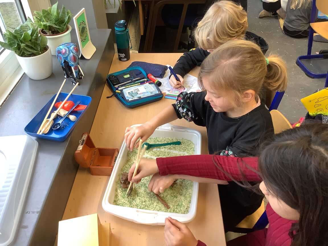 In der Förderzeit bearbeiten wir extra Lernwörter. Das Training macht sehr viel Spaß, weil wir die Wörter an Stationen ganz unterschiedlich bearbeiten dürfen. Es gibt Regenbogenstifte, Buchstabenstempel, Kreide für den Schulhof, aber auch Buchstabenperlen in Eiern, die heraus "purzeln".