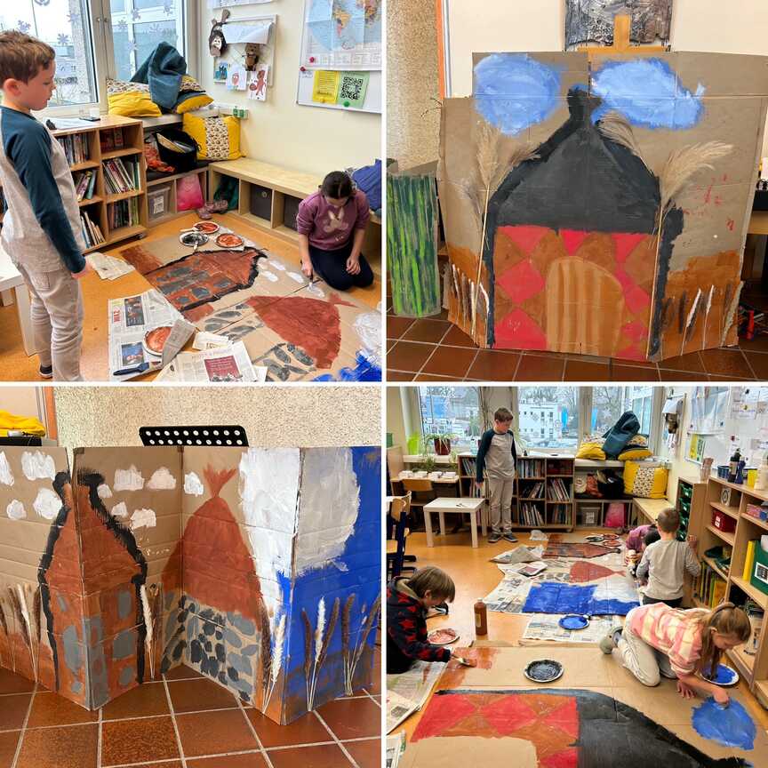 Für das Bühnenbild malten die Biber in Übergröße Rundhäuser auf Pappen, bauten Mörser und zeigten dort viel Fantasie.