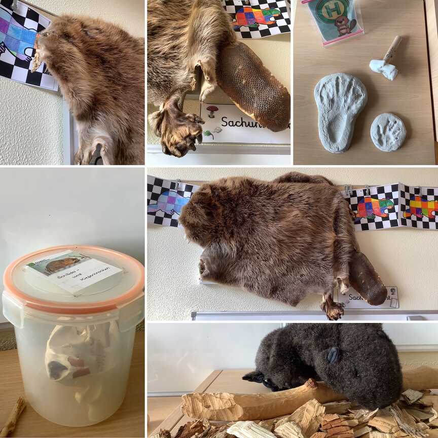 In den ersten Wochen des neuen Schuljahres durften wir den Biber in unserem Klassenraum hautnah kennenlernen. Wir haben viele Anschauungsmaterialien des scheuen Nagetiers in unserer Klasse erkundet, u.a. das Biberfell, den Schädel- und Kieferknochen und Pfotenabdrücke, und konnten so einiges über den Körperbau und die Lebensweise des Tieres erfahren.