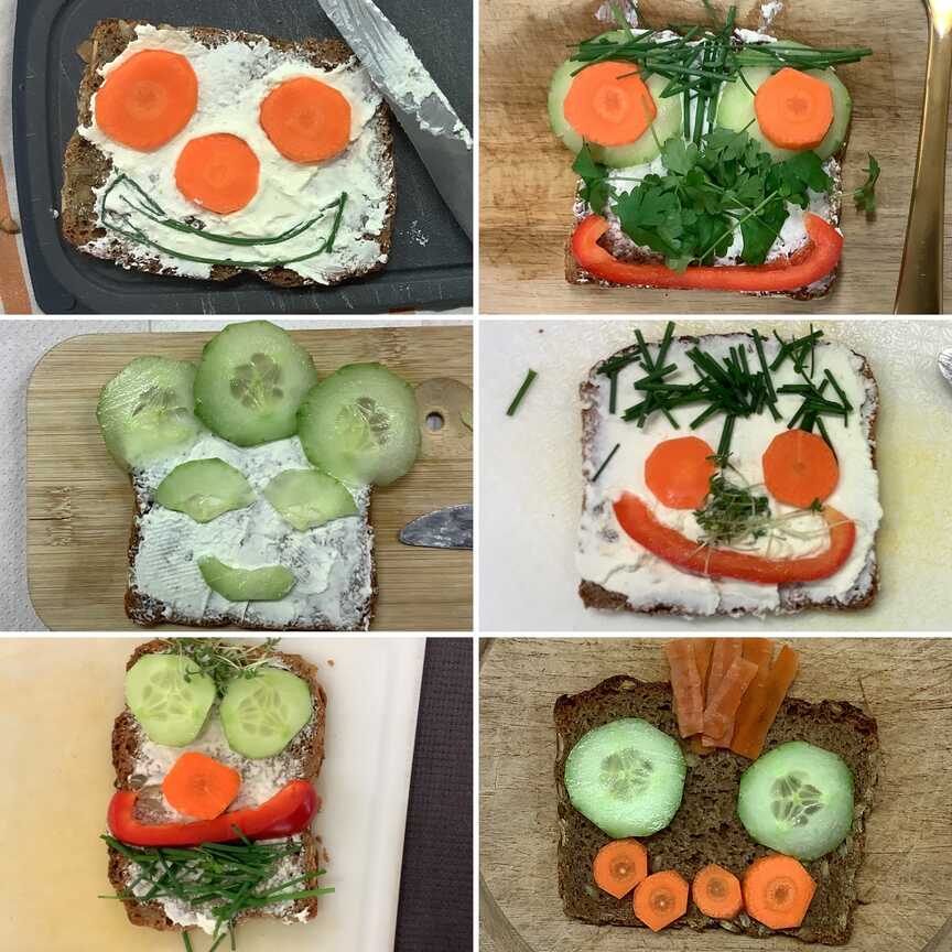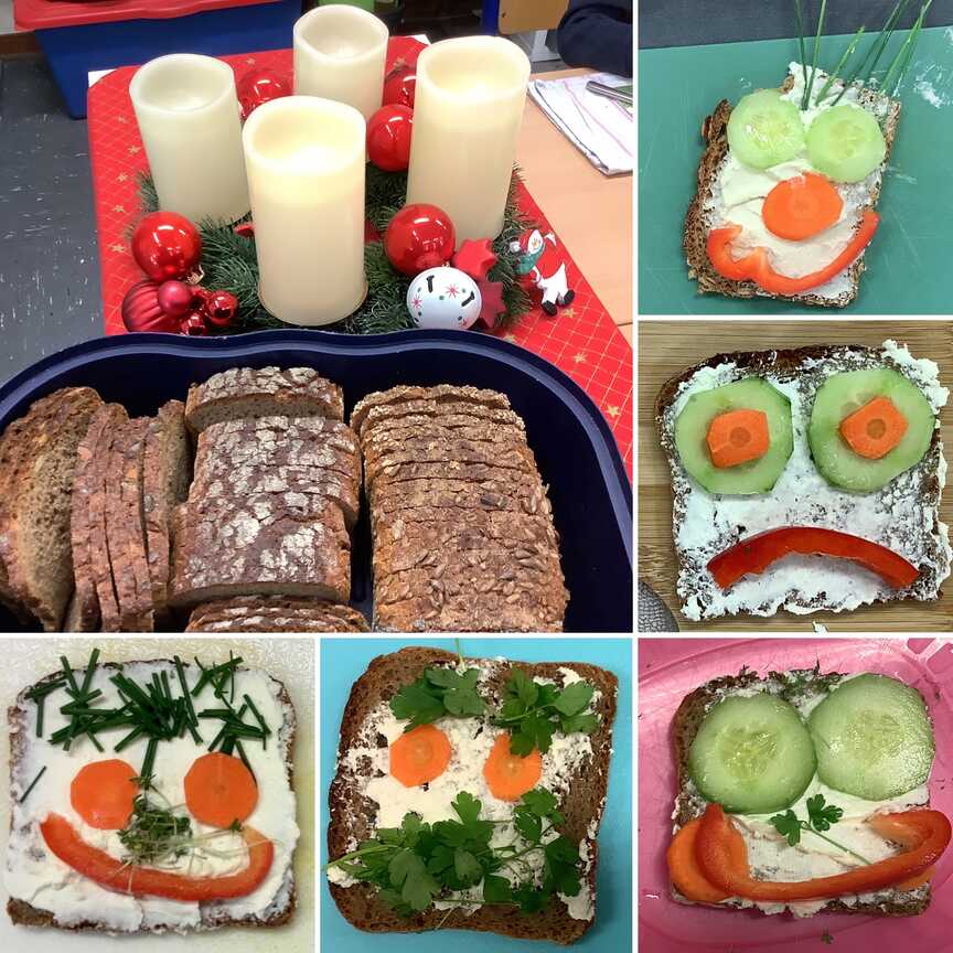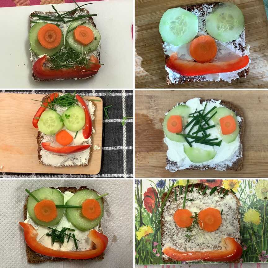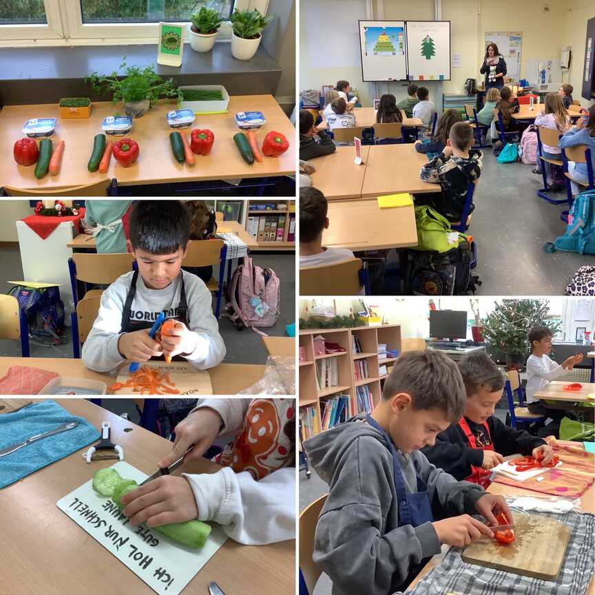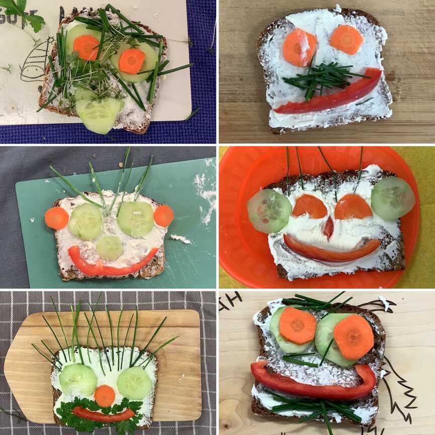Unser neues Sachunterrichtsthema startete mit einem Besuch und der Ernährungspyramide. Wir wuschen, schnitten und aßen Gemüse, das wir auf unseren Brotscheiben als Gesichter dekorierten. So schmeckt Gemüse noch besser!