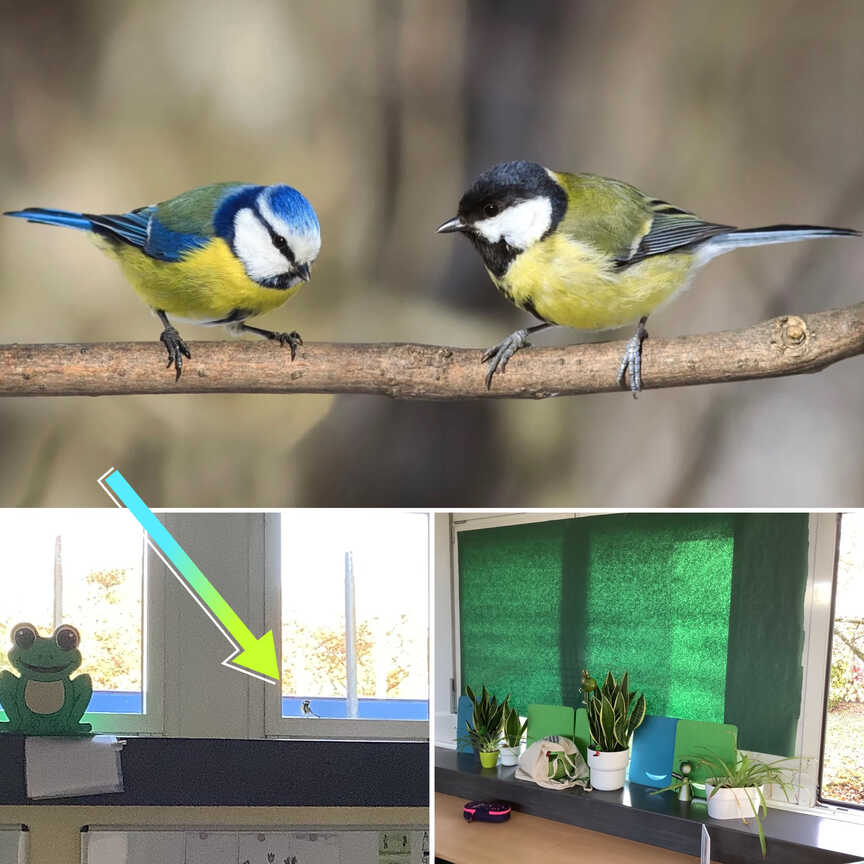 Durch ein gekipptes Fenster hat es eine Meise geschafft, unseren Klassenraum zu erobern. Kurzerhand haben die Kinder auf dem Flur 'Ich sehe was, was du nicht siehst' und anderes gespielt, während zwei Oberfrösche versuchten, den Vogel zurück in die Freiheit zu entlassen. Diese Rettungsaktion gestaltete sich leider als ziemlich schwierig, da Vögel keine Fensterscheiben erkennen können und unser tierischer Freund leider nicht die richtigen Fenster erwischte. Aus diesem Grund versuchten wir dem Vogel zu helfen, in dem wir die geschlossenen Fenster mit Geschenkpapier zuklebten oder mit Teppichen und Stühlen zustellten. (Das sah sehr lustig aus.) Und tatsächlich: kurz vor Stundenende flatterte die Meise zurück in die Freiheit!
