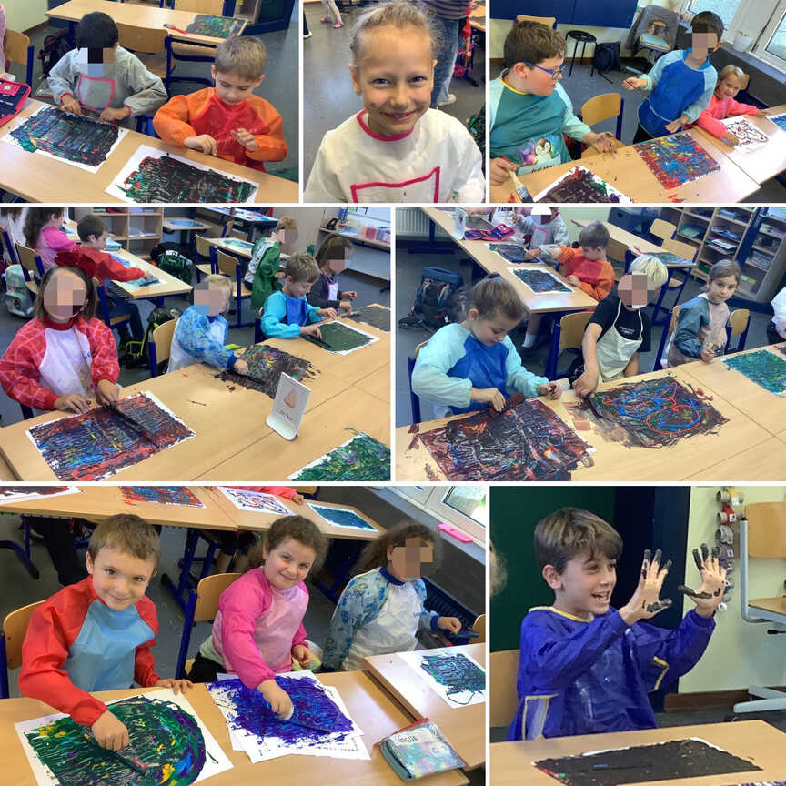 Dieses Jahr haben wir unsere Malunterlagen mit der Spachteltechnik gestaltet. Das gehört mit zum Action Painting. Hierbei ist nicht das Ergebnis, sondern viel mehr der Prozess des Gestaltens wichtig. Es war eine riesige Sauerei, bei der wir alle viel Spaß hatten. Wir sind schon gespannt, wie unsere Ergebnisse am Ende aussehen.