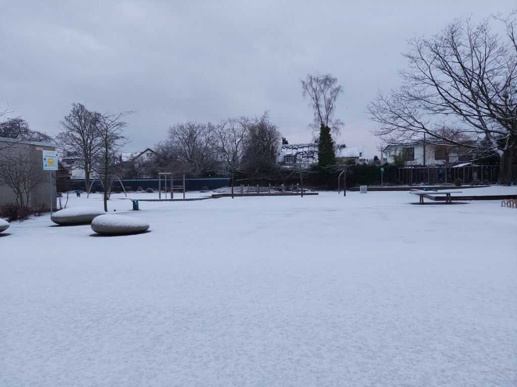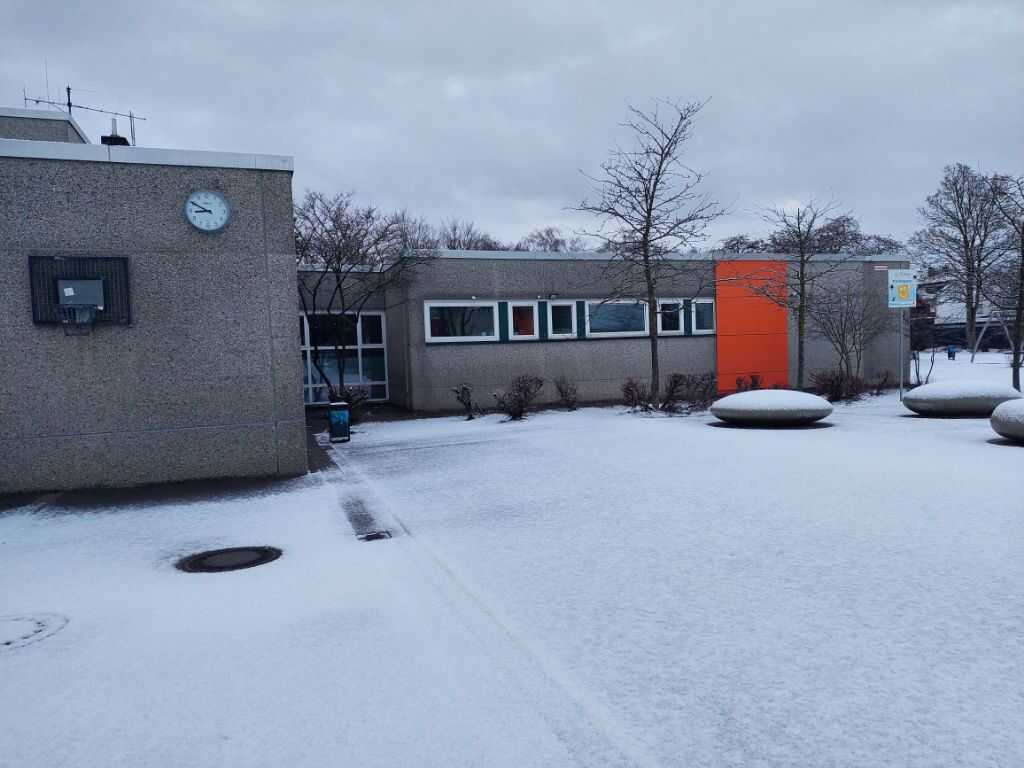 Pünktlich zum ersten Schultag im neuen Jahr sieht der Schulhof aus wie ein Winterwunderland.